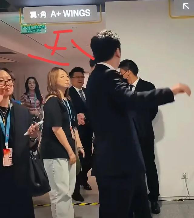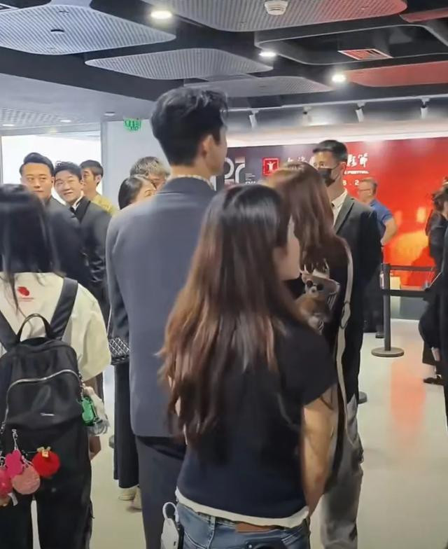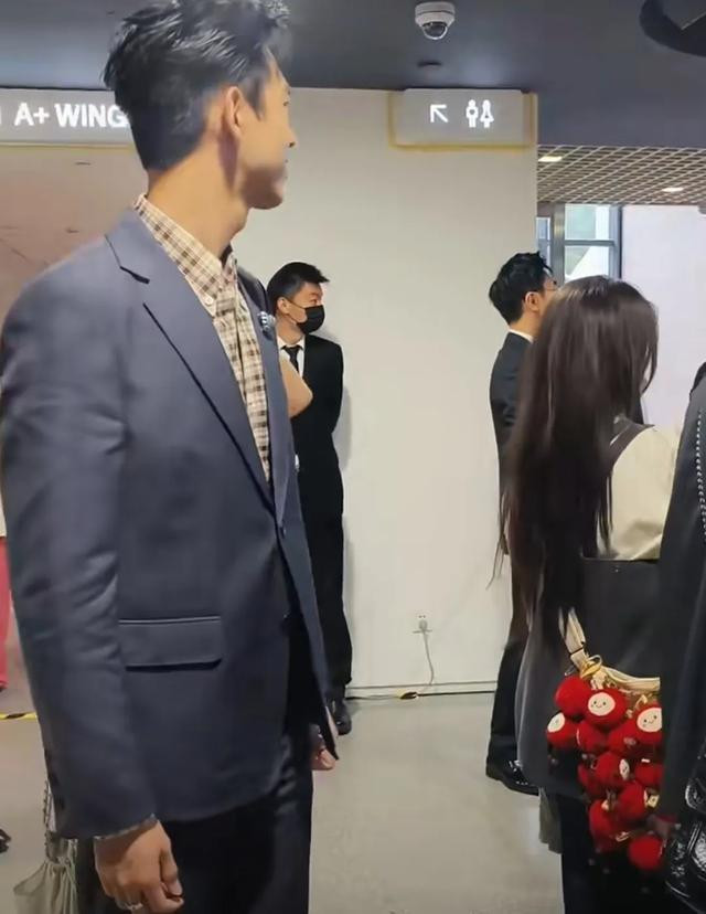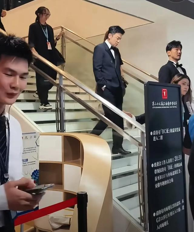 王传君和雷佳音一前一后走下楼梯,途中,有人喊住了王传君,两个人寒暄了一阵,雷佳音看到那个人之后,也弯腰点头打招呼